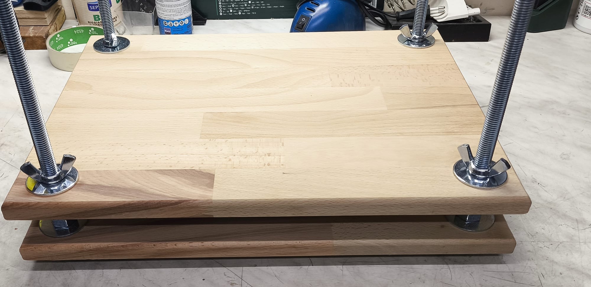 След това ги постави между две дъски и ги притисни с тежест (напр. тухли). А може и да си направиш преса от две дъски с шпилки и крилчати гайки. 😏